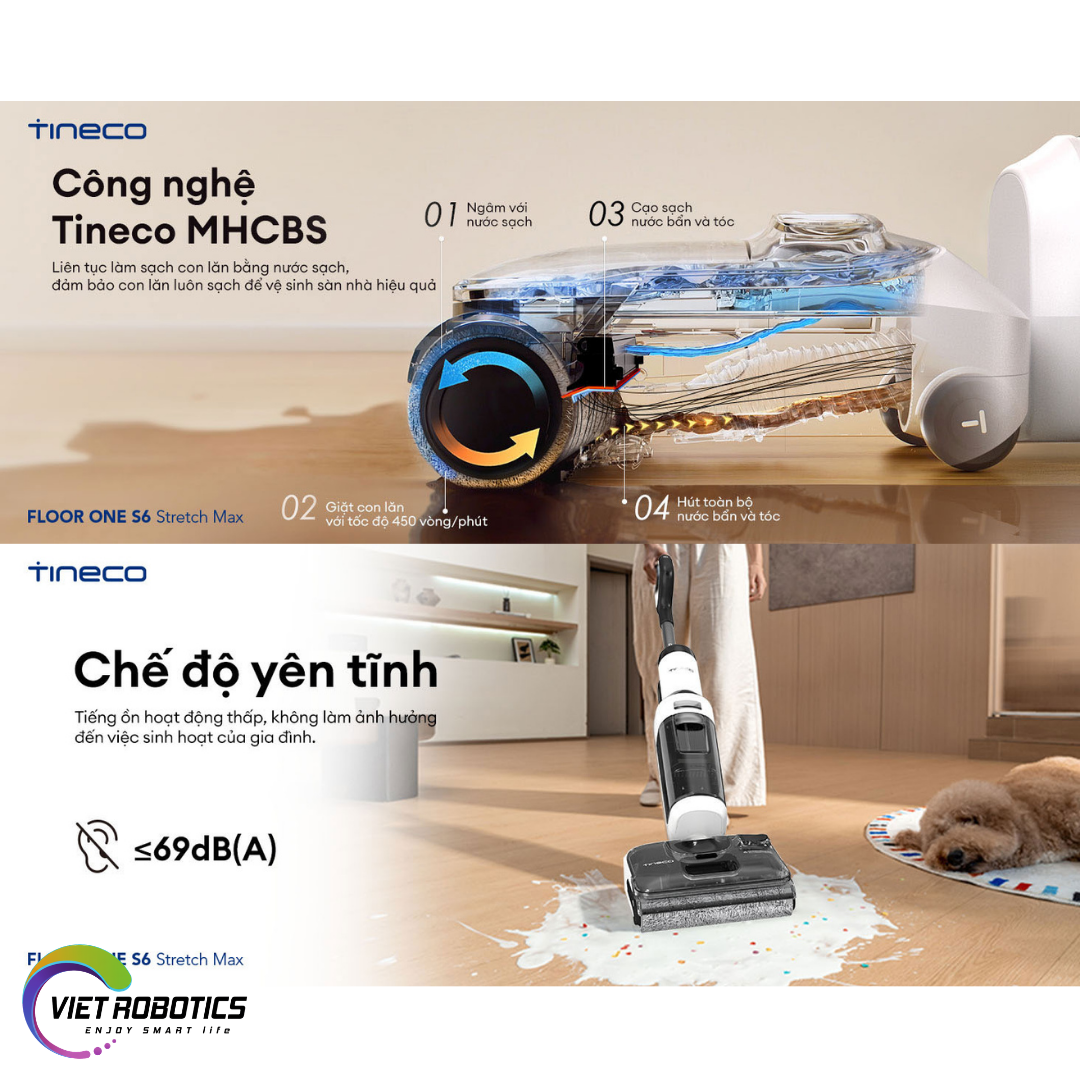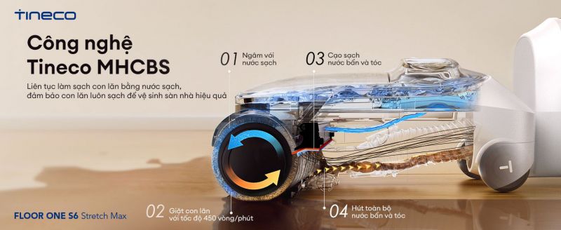 Tineco đã nâng tầm hiệu suất làm sạch trên máy hút bụi lau sàn khô ướt Tineco Floor One S6 Stretch Max nhờ tích hợp công nghệ MHCBS cải tiến. Công nghệ này mang đến quy trình làm sạch chổi lăn liên tục và toàn diện qua bốn bước đồng bộ: