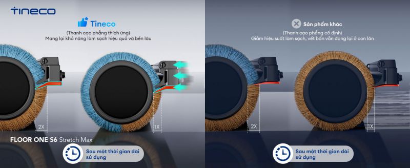 Máy hút bụi Tineco S6 Stretch Max được trang bị thanh cạo phẳng thích ứng. Thanh cạo này có khả năng tự động điều chỉnh theo con lăn trong suốt quá trình hoạt động. Đóng vai trò then chốt trong việc loại bỏ nước bẩn và chất bẩn tích tụ, từ đó cung cấp khả năng làm sạch lâu dài và hiệu quả cho chổi lăn, đảm bảo máy luôn hoạt động với hiệu suất tối ưu, tuổi thọ chổi lăn kéo dài.