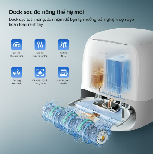 Giặt khăn lau tự động: Khăn lau được giặt sạch ngay sau mỗi chu kỳ, không cần thao tác thủ công.