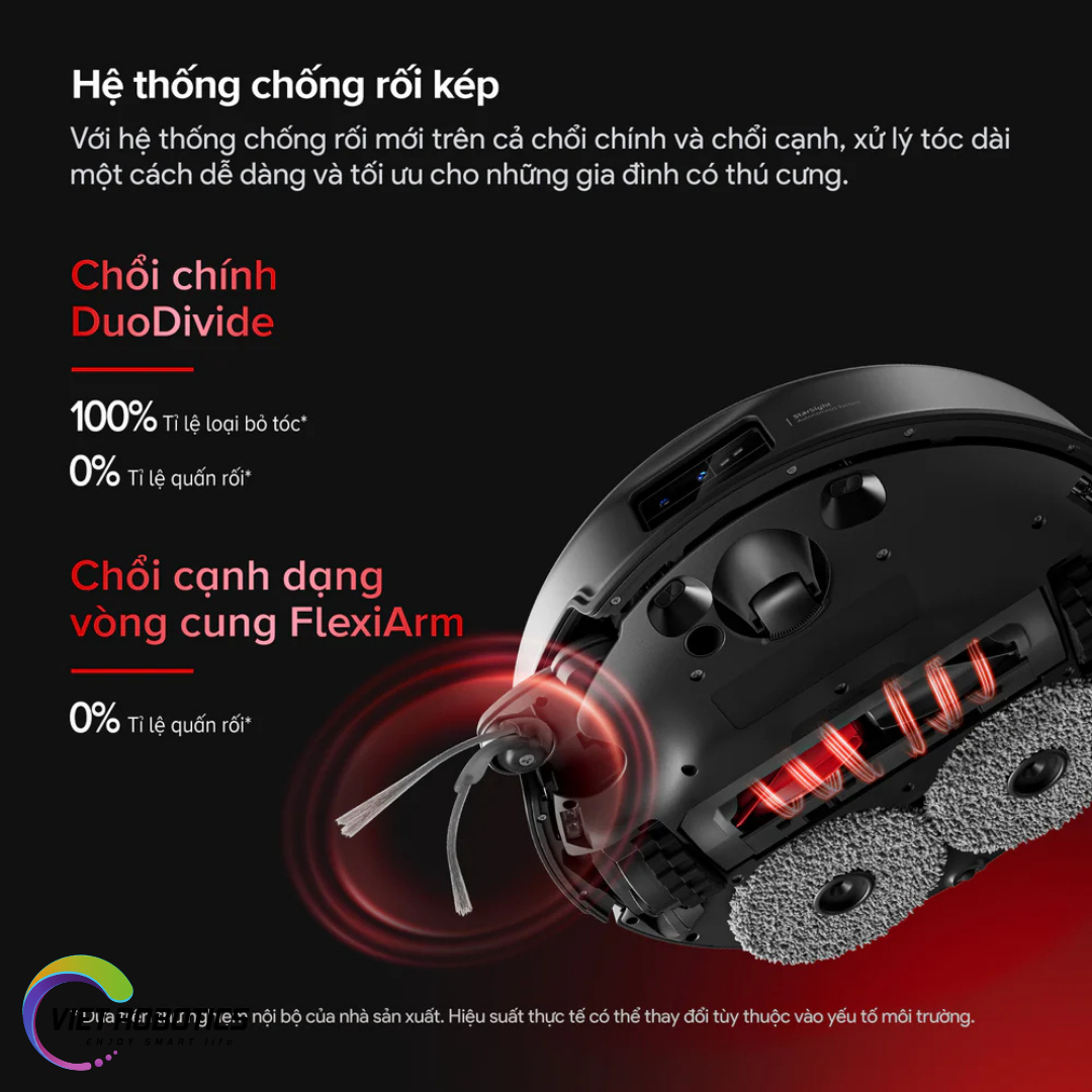 - Hệ thống chống rối kép với chổi chính DuoDivide và chổi cạnh FlexiArm, quét sát mép tường không quấn tóc