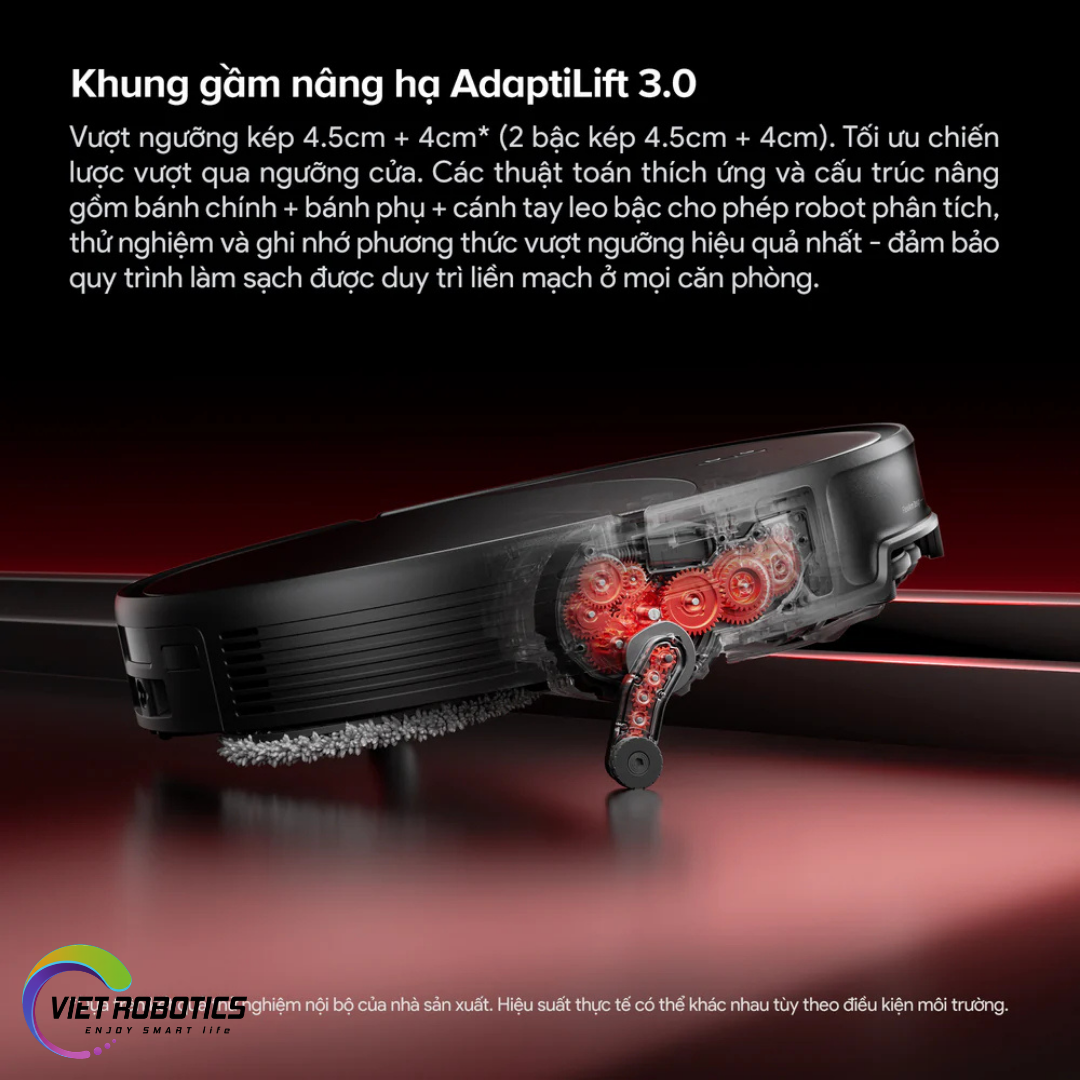 Vượt ngưỡng kép 4.5cm + 4cm* (2 bậc kép 4.5cm + 4cm). Tối ưu chiến lược vượt qua ngưỡng cửa. Các thuật toán thích ứng và cấu trúc nâng gồm bánh chính + bánh phụ + cánh tay leo bậc cho phép robot phân tích, thử nghiệm và ghi nhớ phương thức vượt ngưỡng hiệu quả nhất – đảm bảo quy trình làm sạch được duy trì liền mạch ở mọi căn phòng.